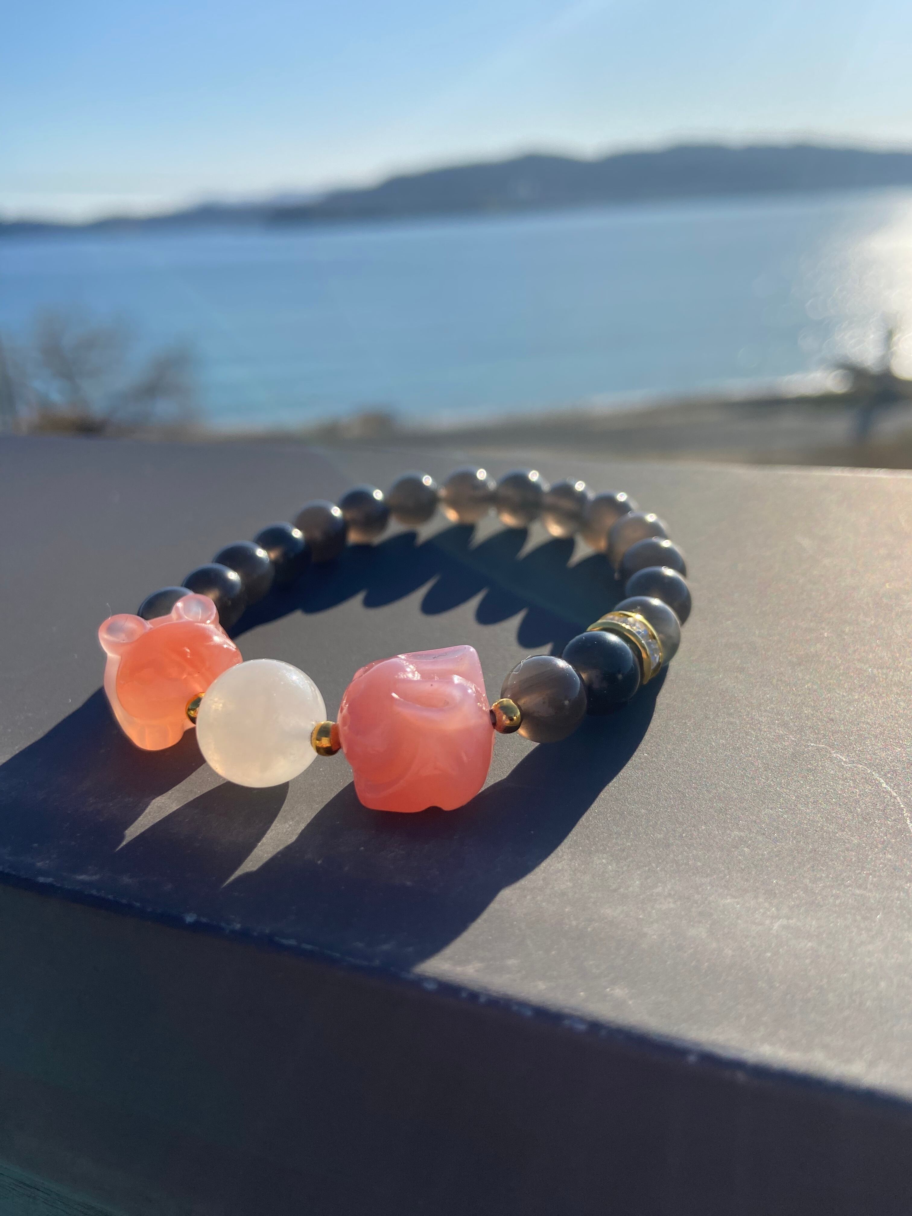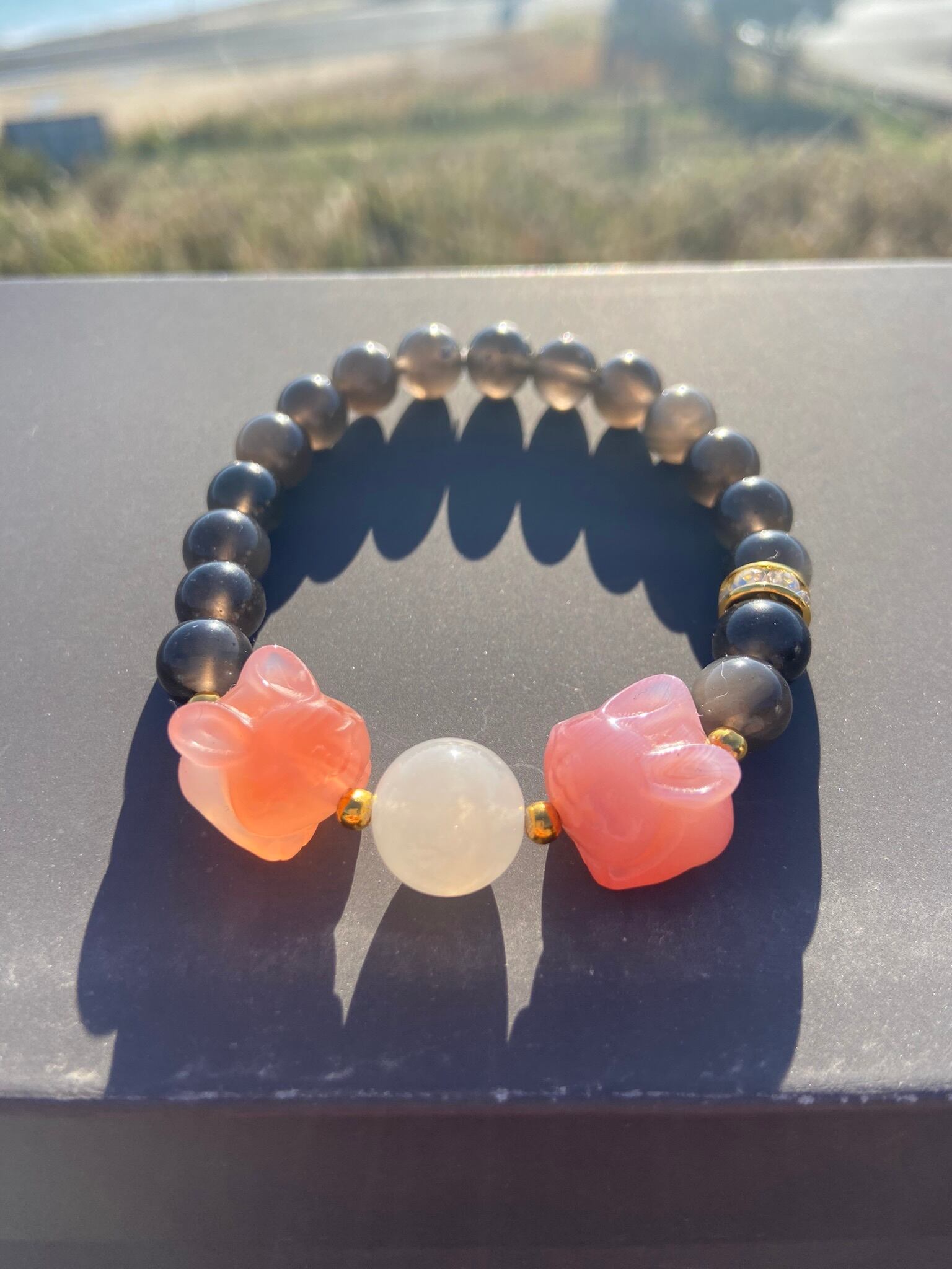 チンターマニストーン6mm、塩原めのうウサギ14mm、ムーンストーン11mm