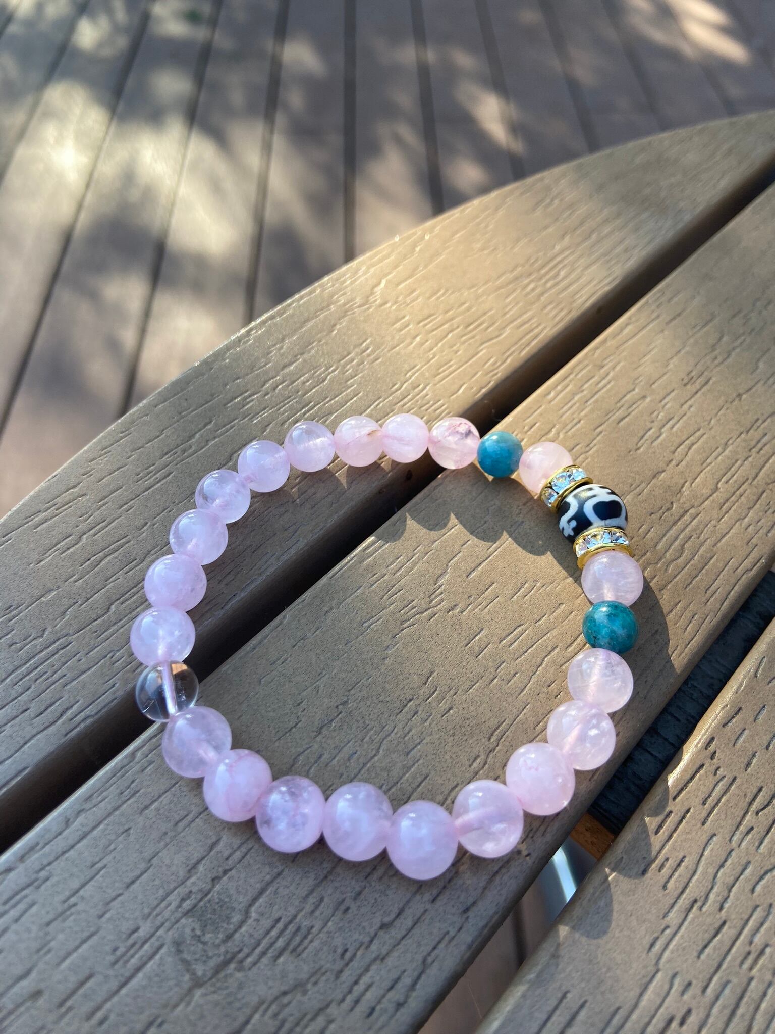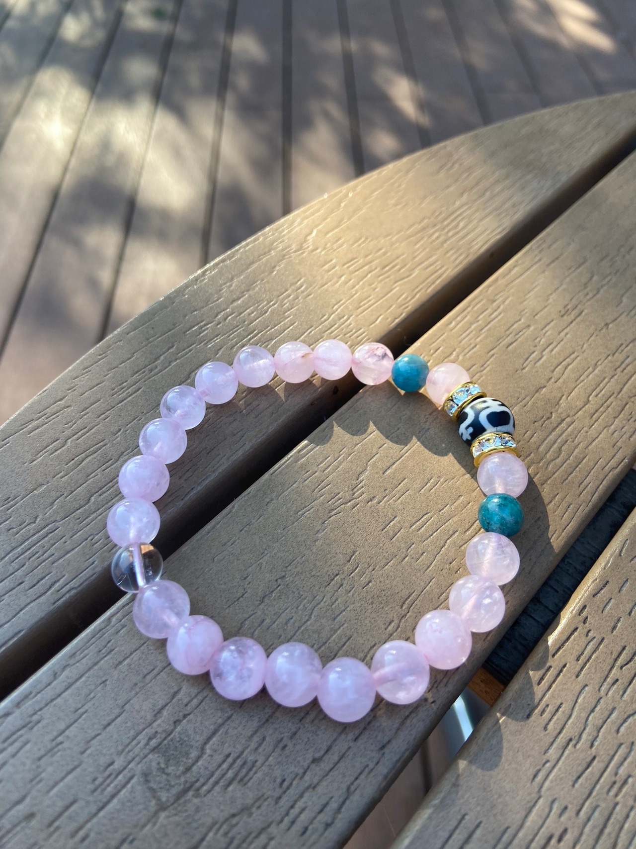 ローズクオーツ6mm、アパタイト5mm、宝瓶天珠8mm、プラチナルチル5mm