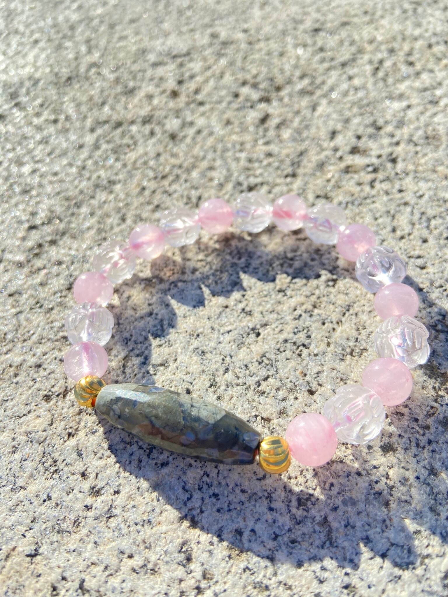 蓮彫水晶10mm、ローズクオーツ6mm、ケセラセラストーンチューブ型30mm×6mm