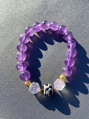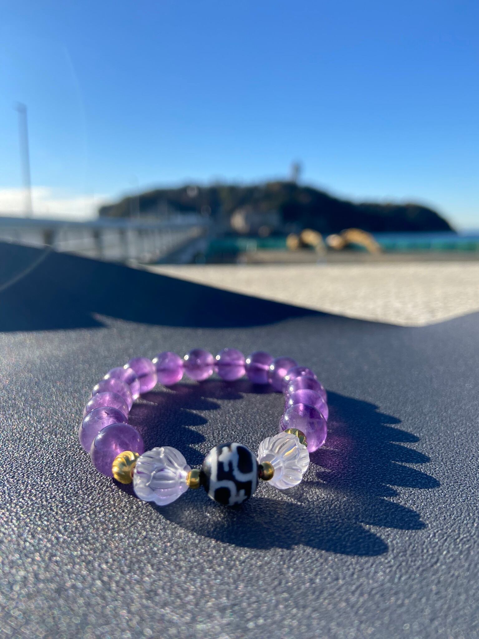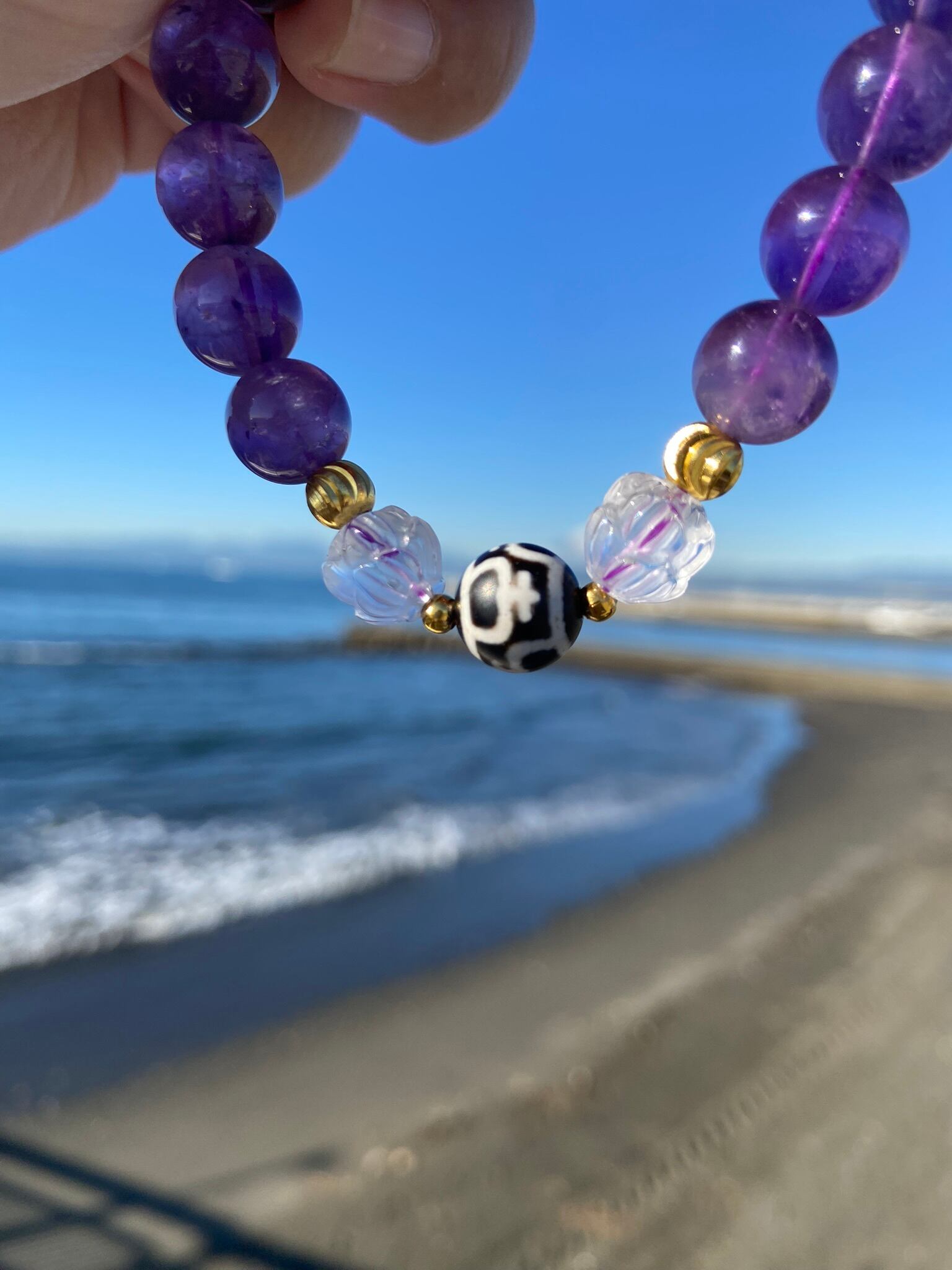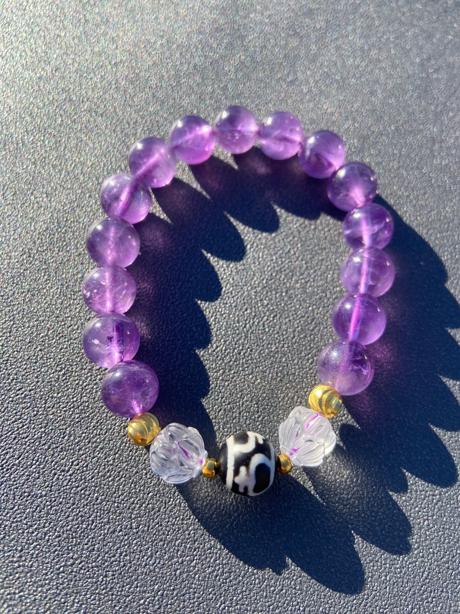 アメジスト10mm、蓮彫水晶10mm、宝瓶天珠10mm
