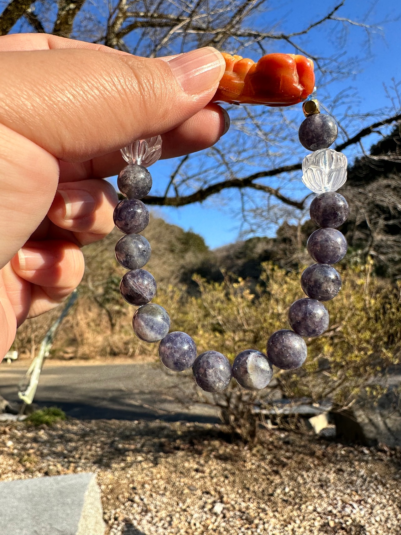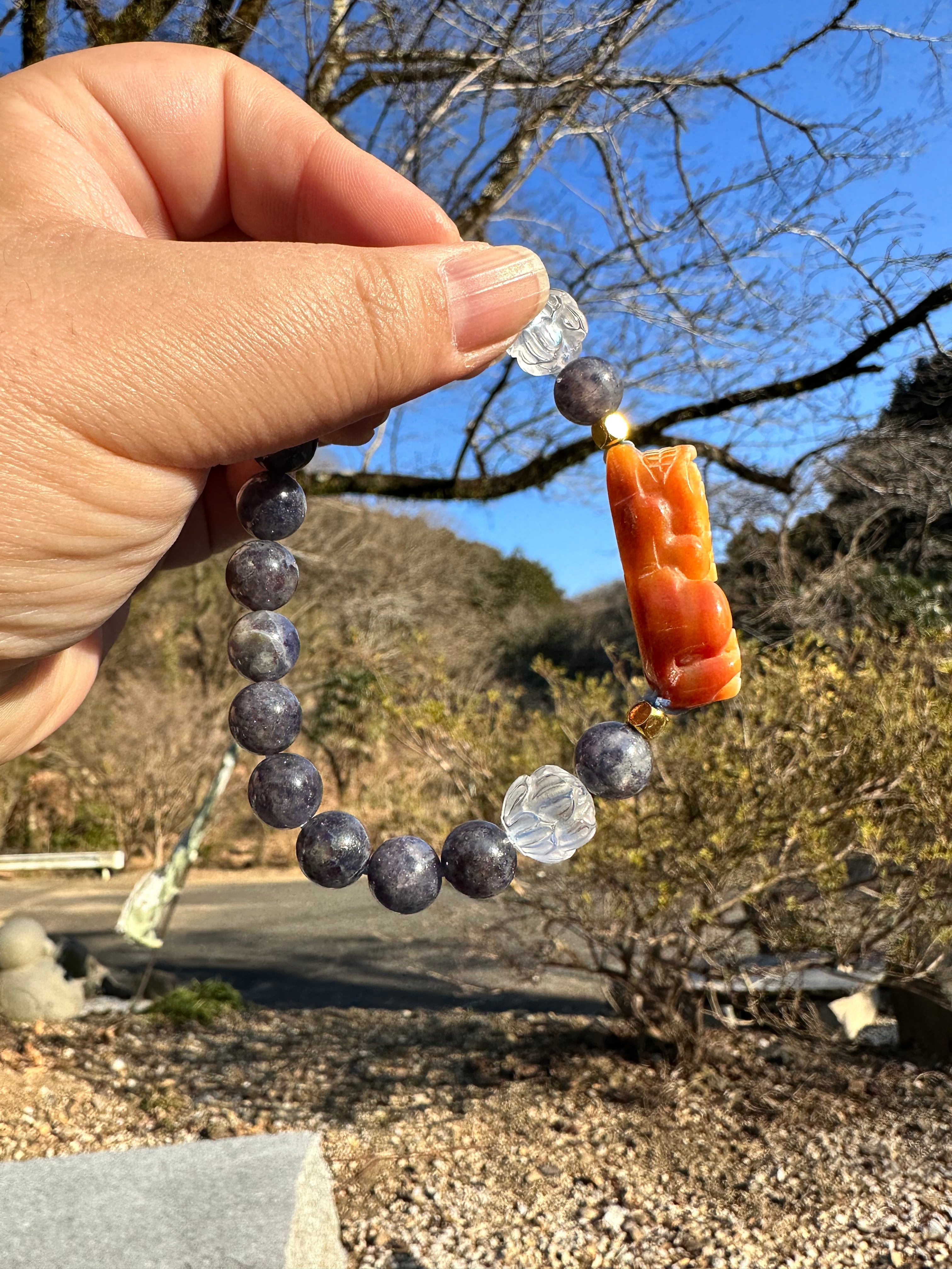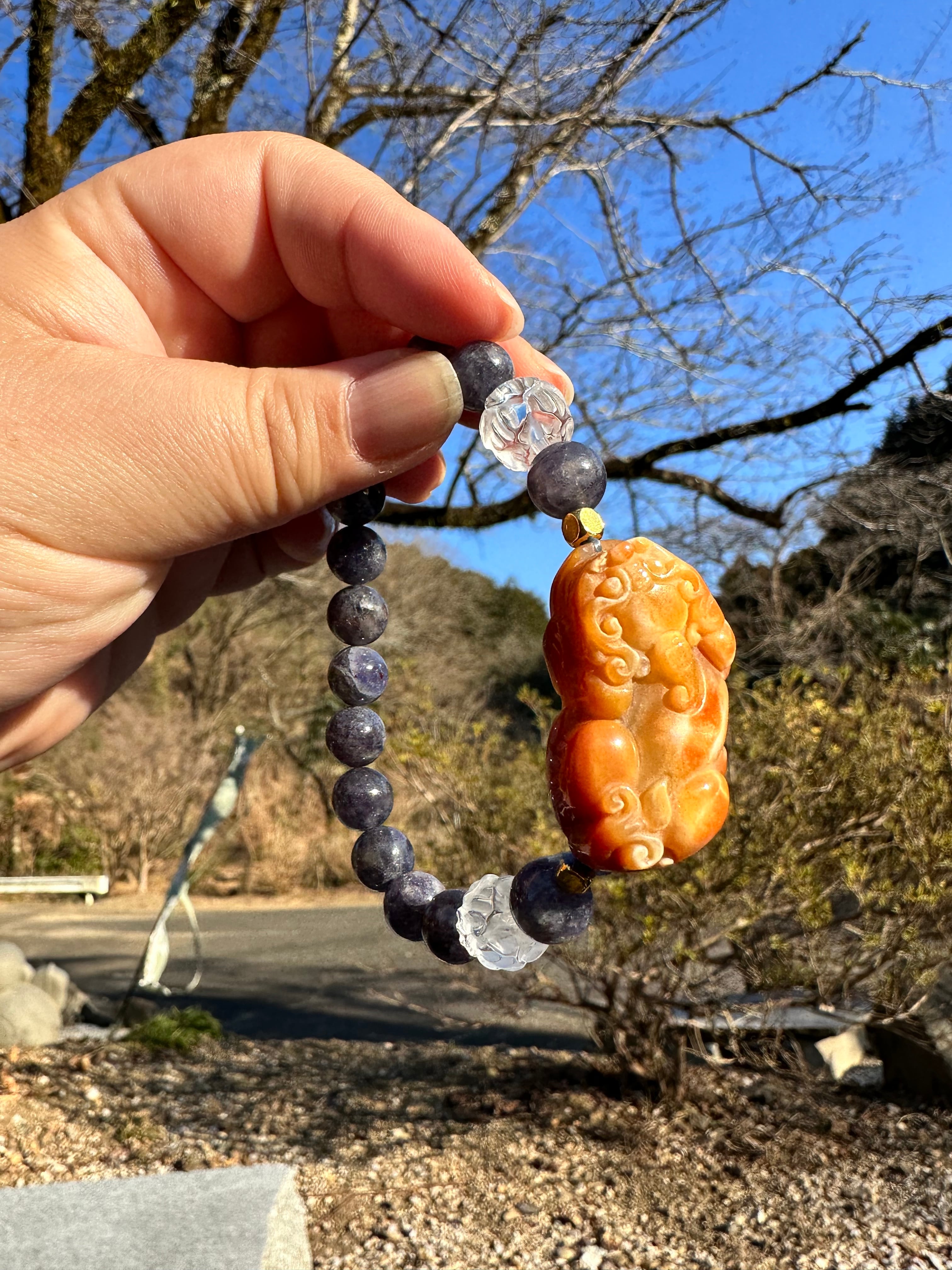 アイオライト8mm、蓮彫水晶10mm、オレンジ瑪瑙のヒキュウ40mm×20mm×10mm