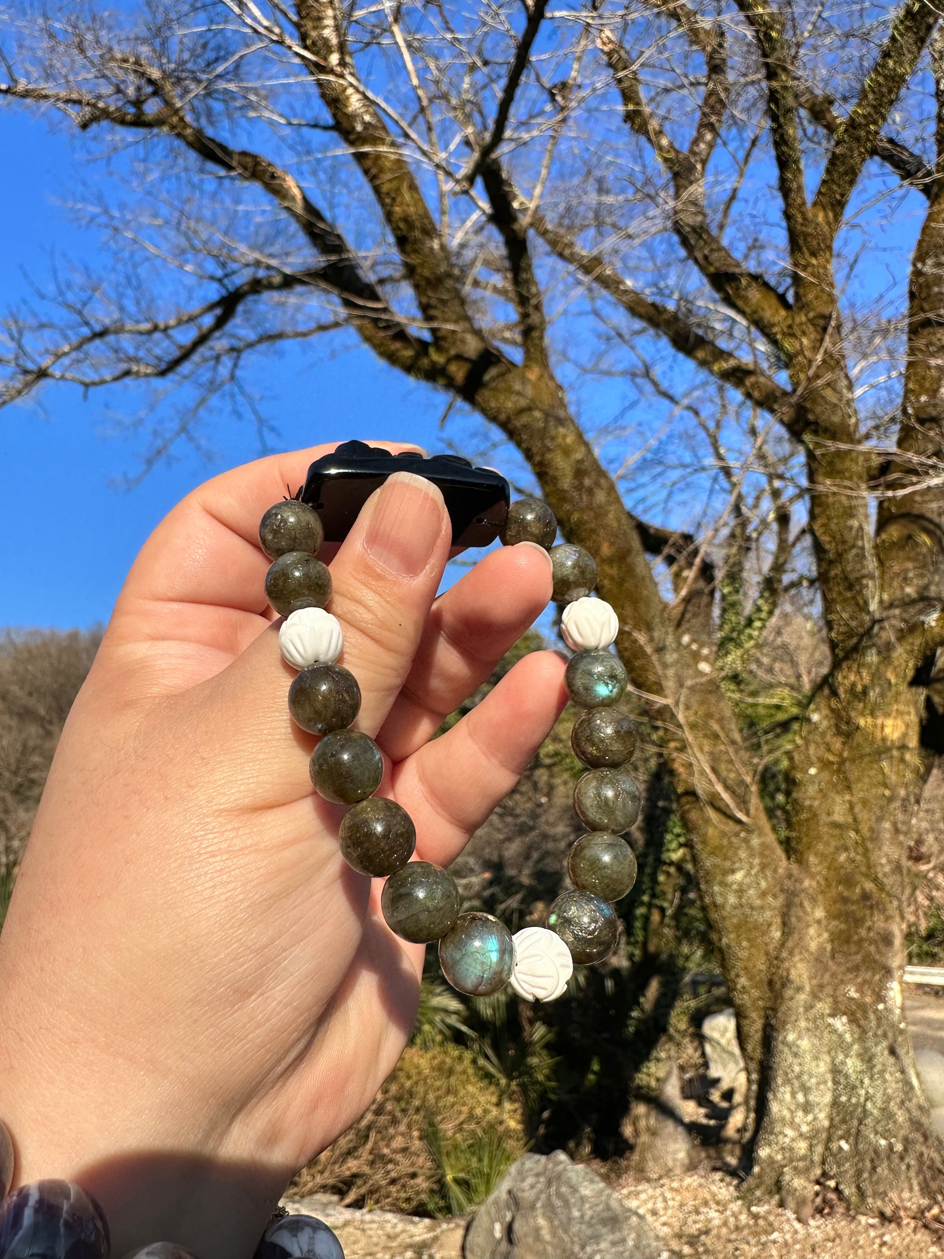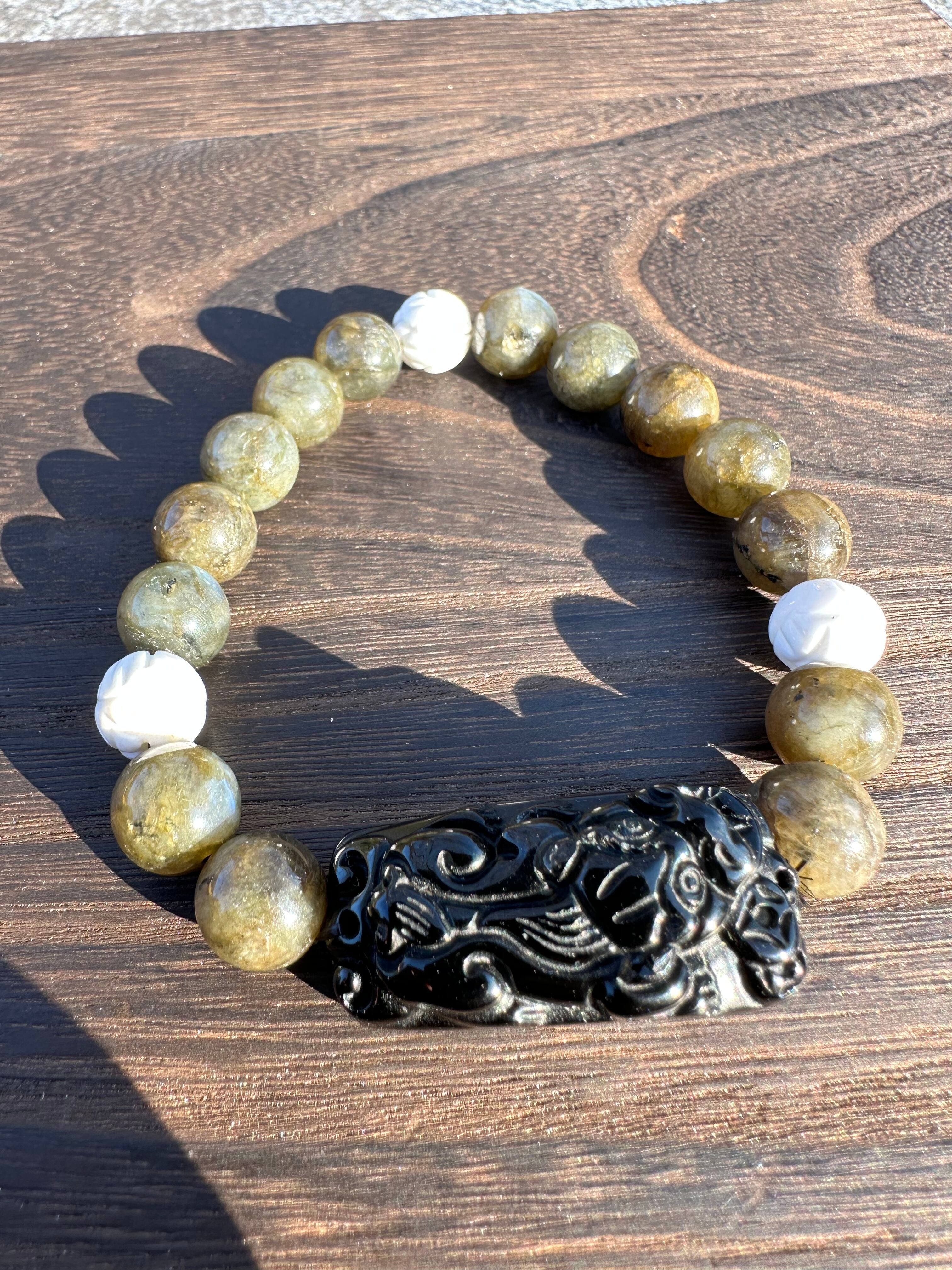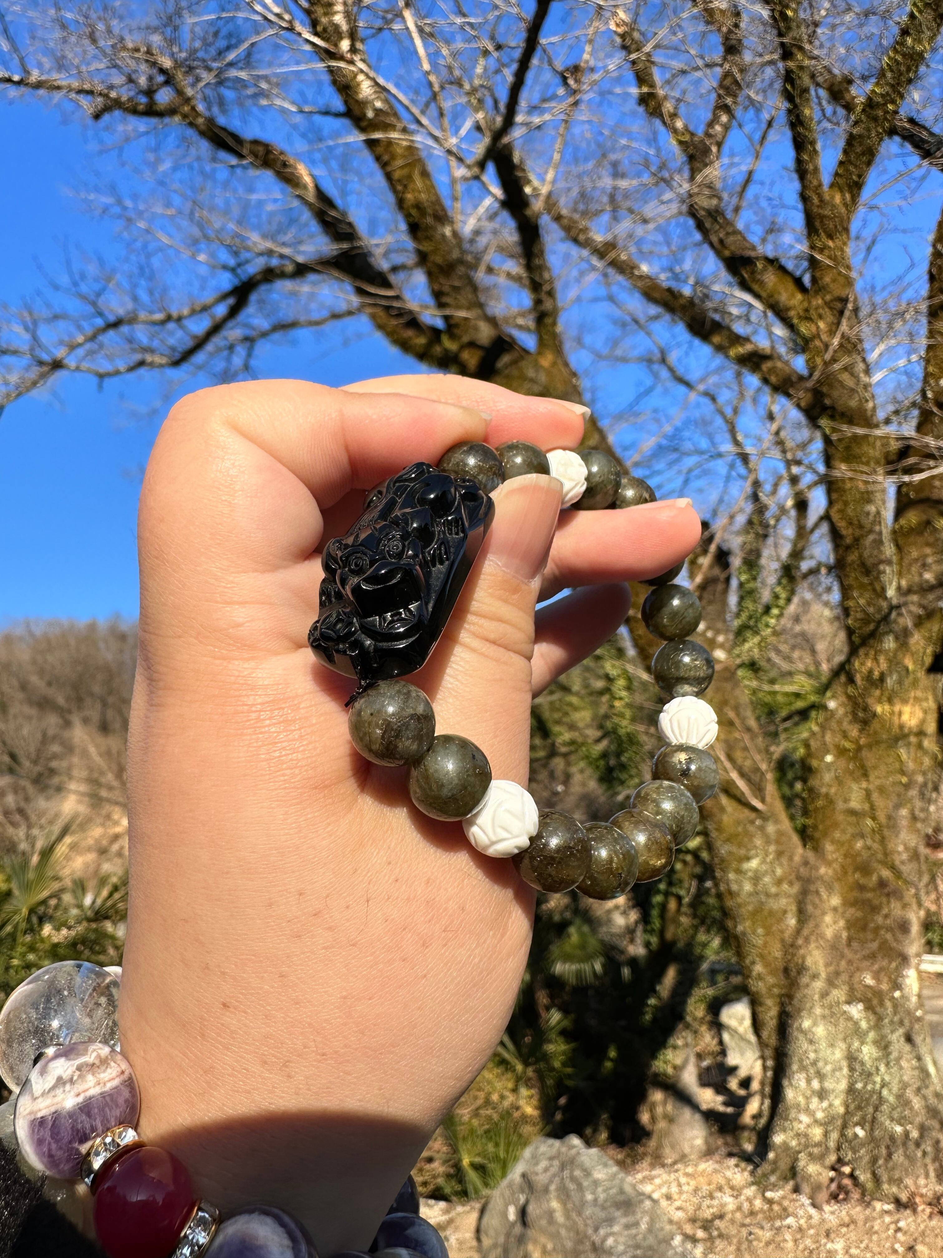 ブラックラブラドライト10mm、蓮彫ホワイトオニキス、オニキスのヒキュウ40mm×15mm×15mm