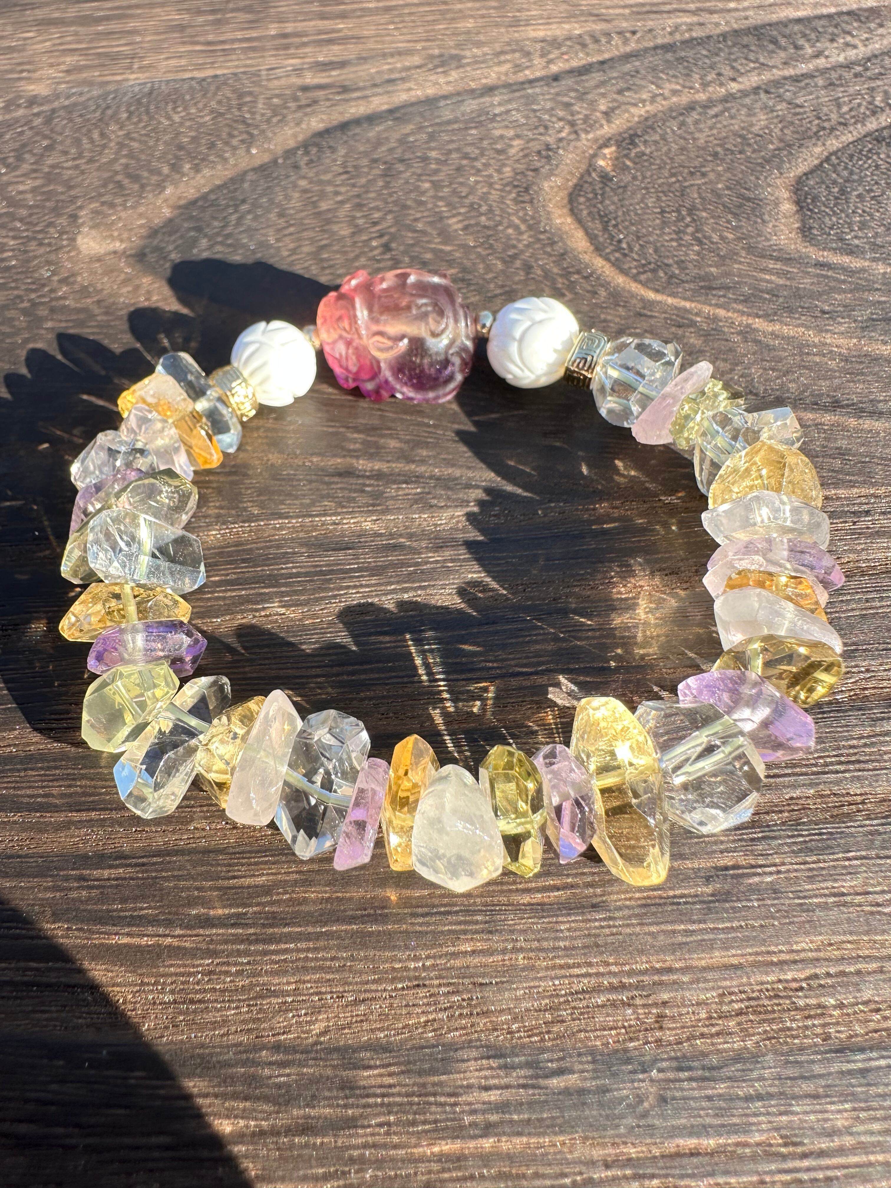 ファイブミックスクォーツ(水晶、アメジスト、ローズクォーツ、シトリン、グリーンアメジスト)多面カット、蓮彫ホワイトオニキス10mm、フローライトの龍亀(ロングイ)