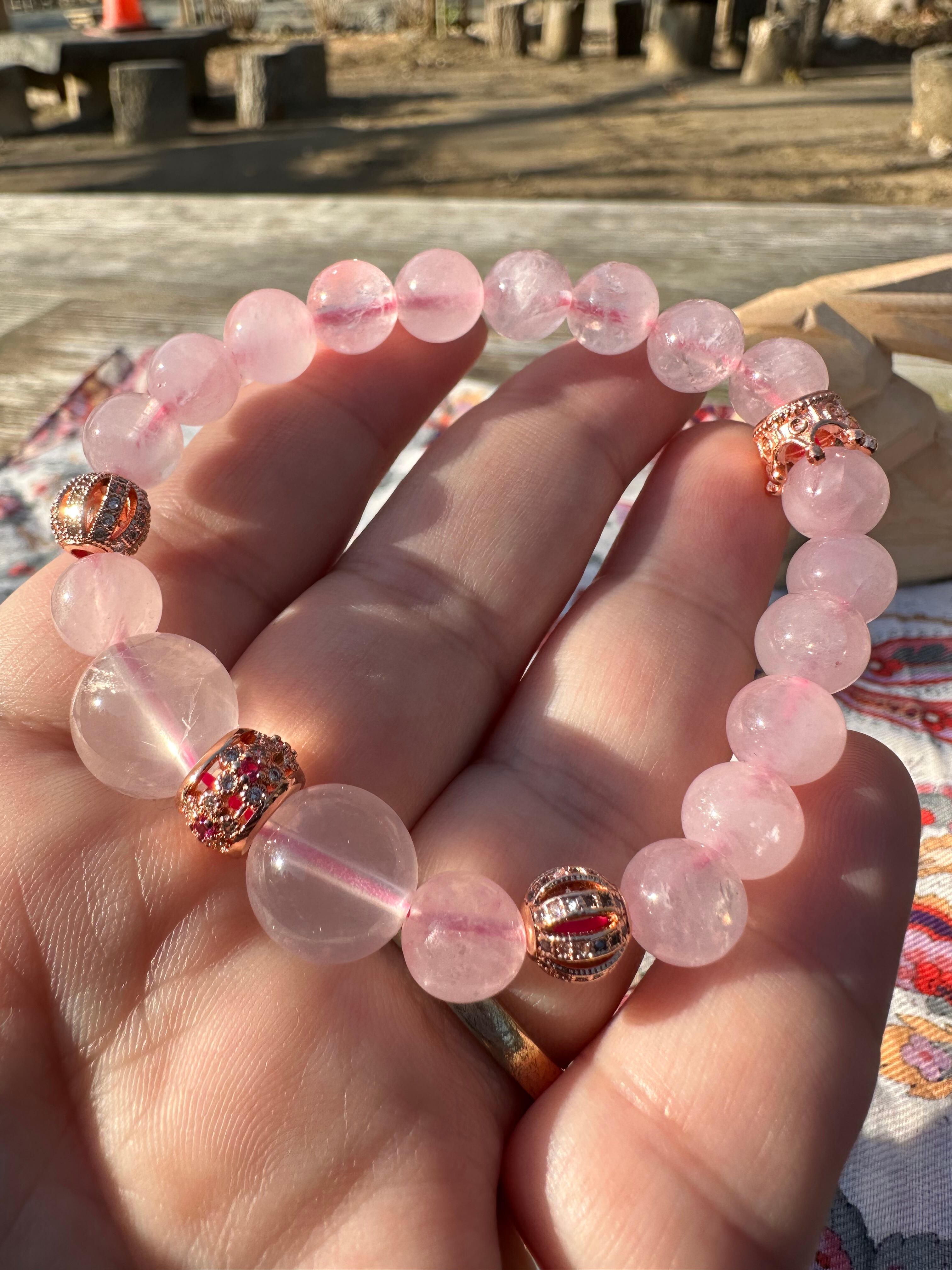 ローズクォーツ6mm、スターローズクォーツ12mm、ピンクゴールドパーツ