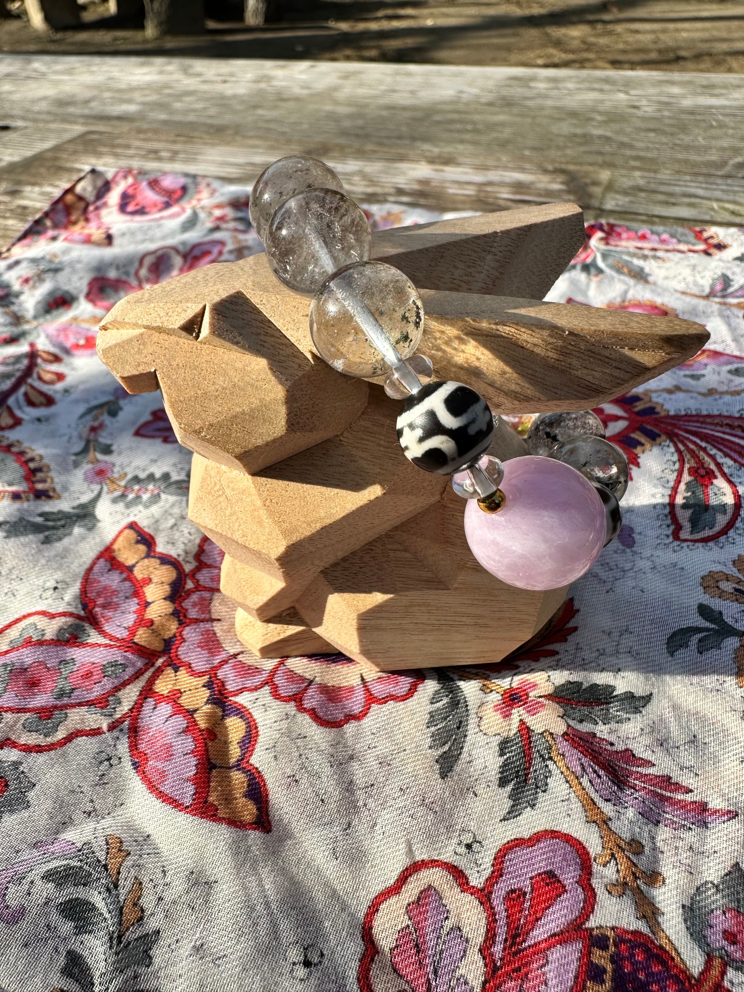 ガーデンクォーツ12mm、水晶卵型4mm、宝瓶天珠10mm、クンツァイト14mm