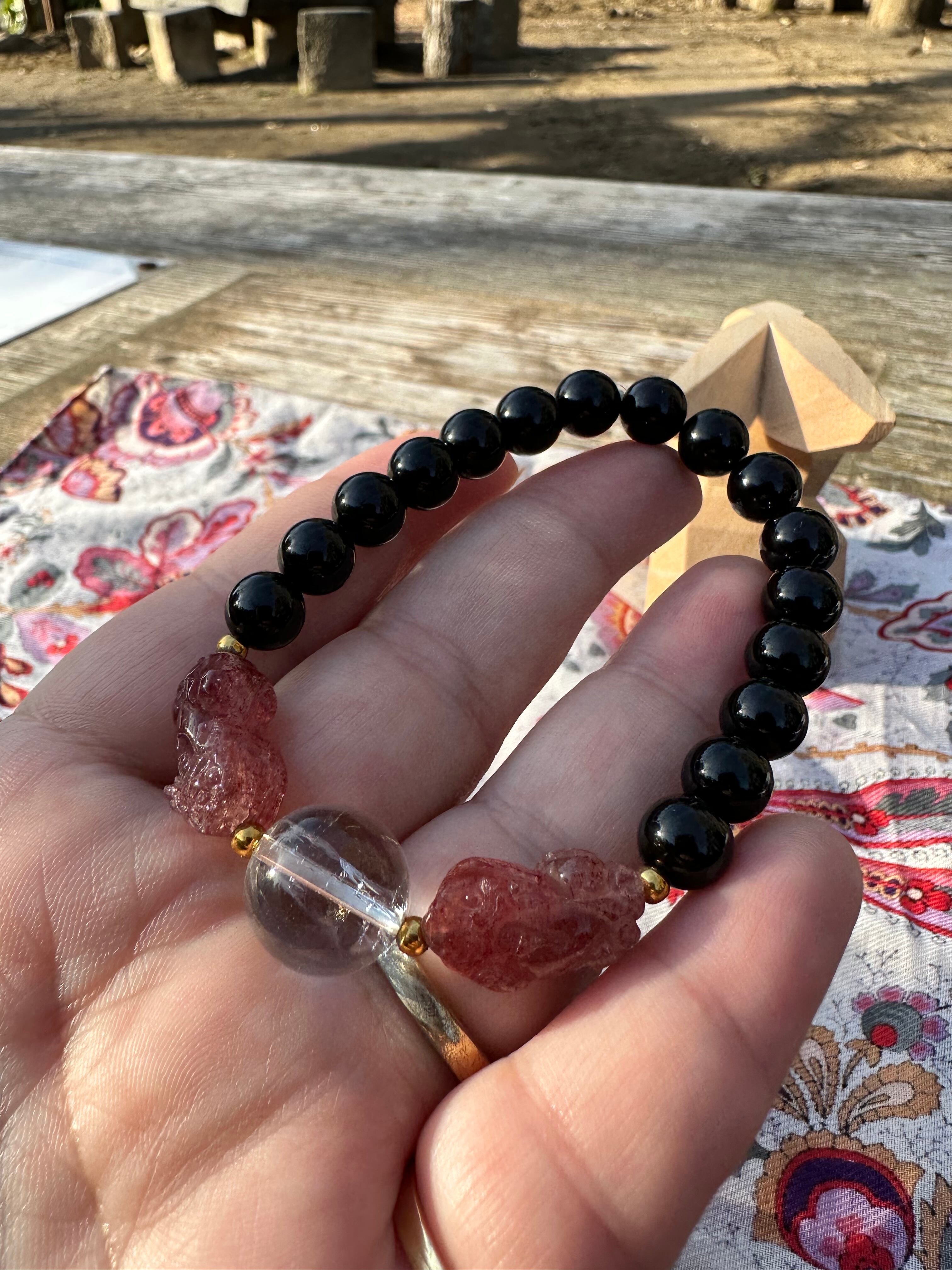 モリオン6mm、ストロベリークォーツの貔貅ペア、クラック水晶12mm
