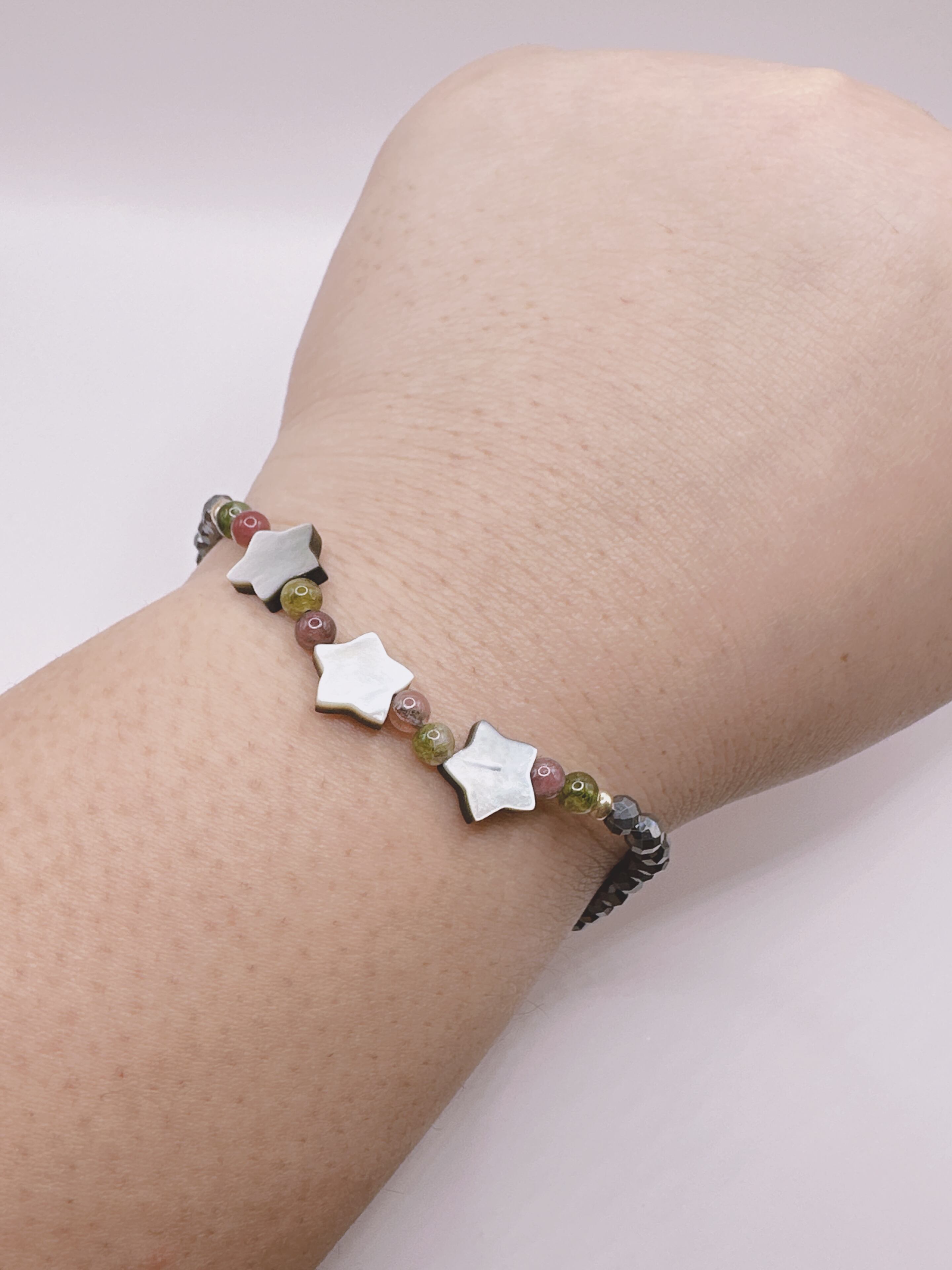 ヘマタイト4mm、ミックストルマリン4mm、スターシェル3つ