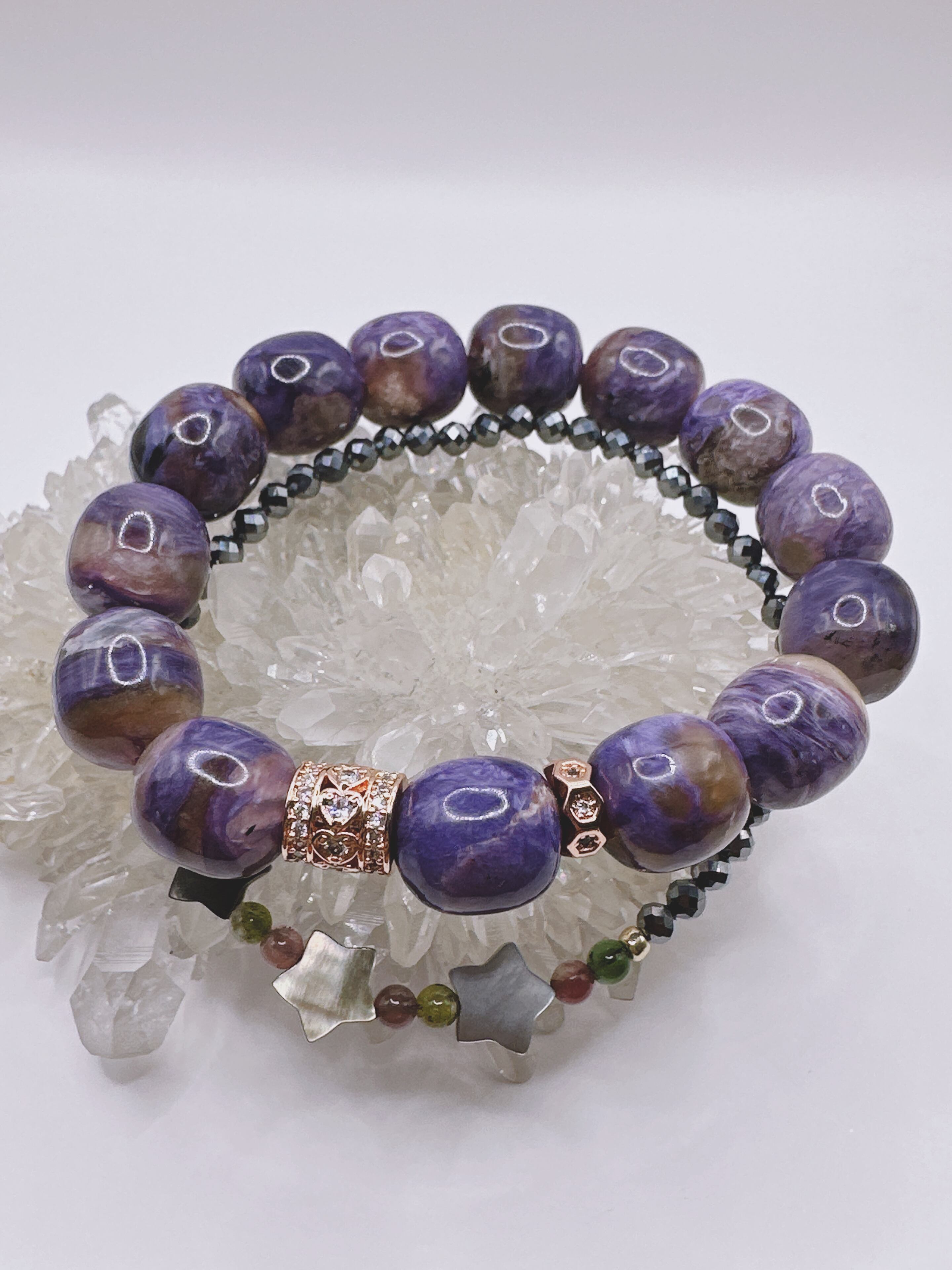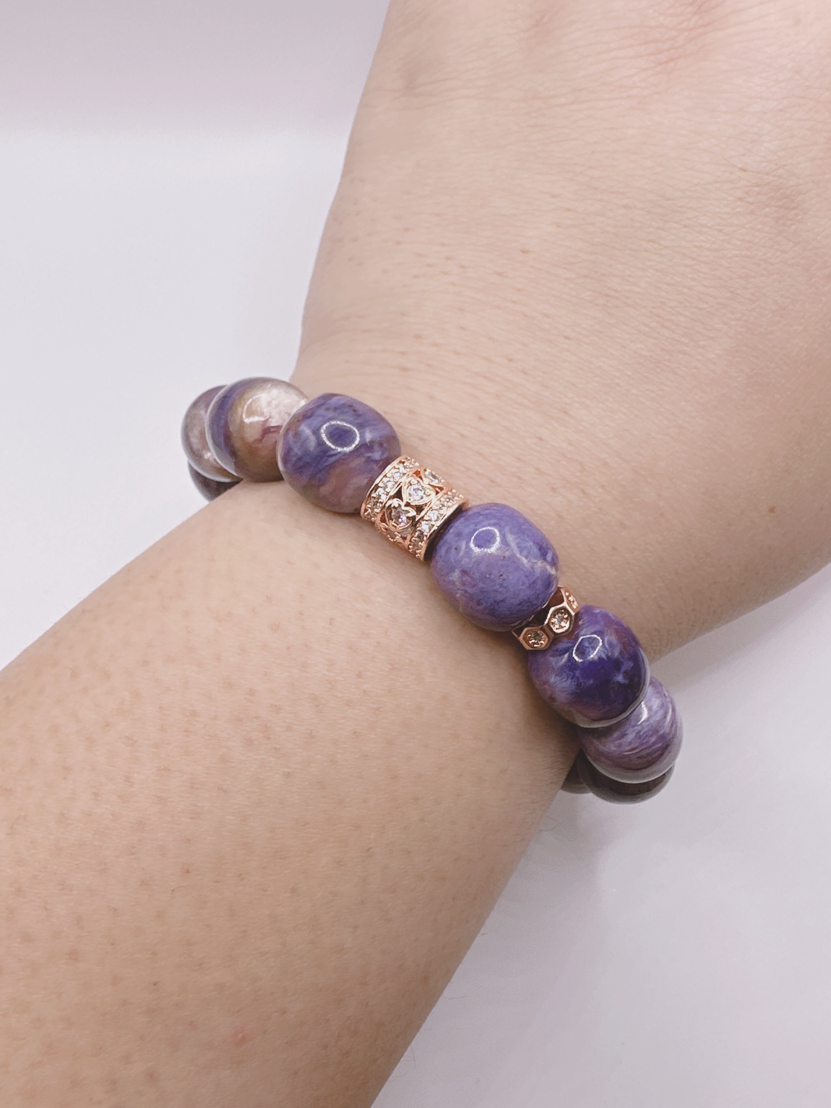 チャロアイト樽形14mm、ピンクキラキラパーツ