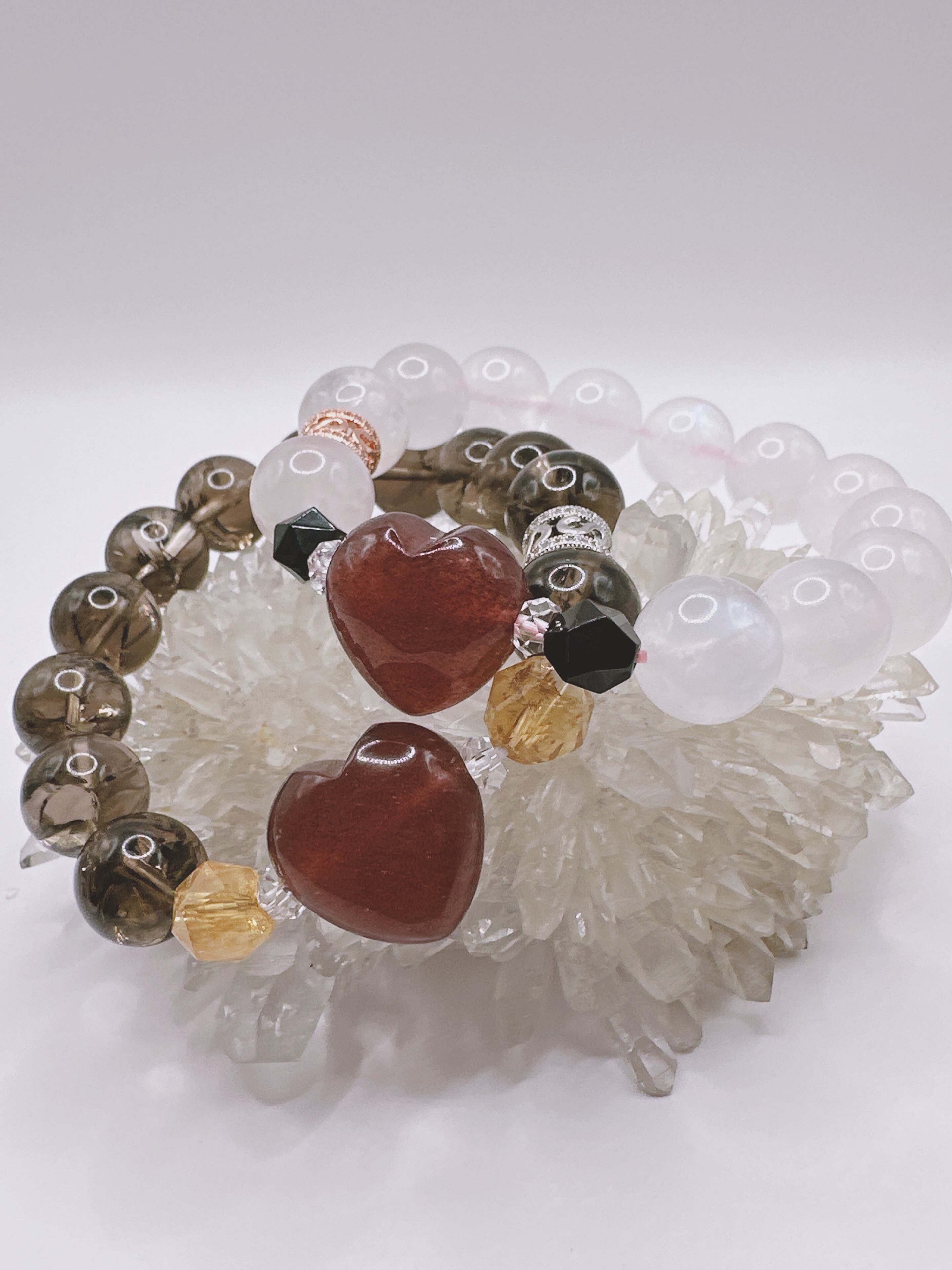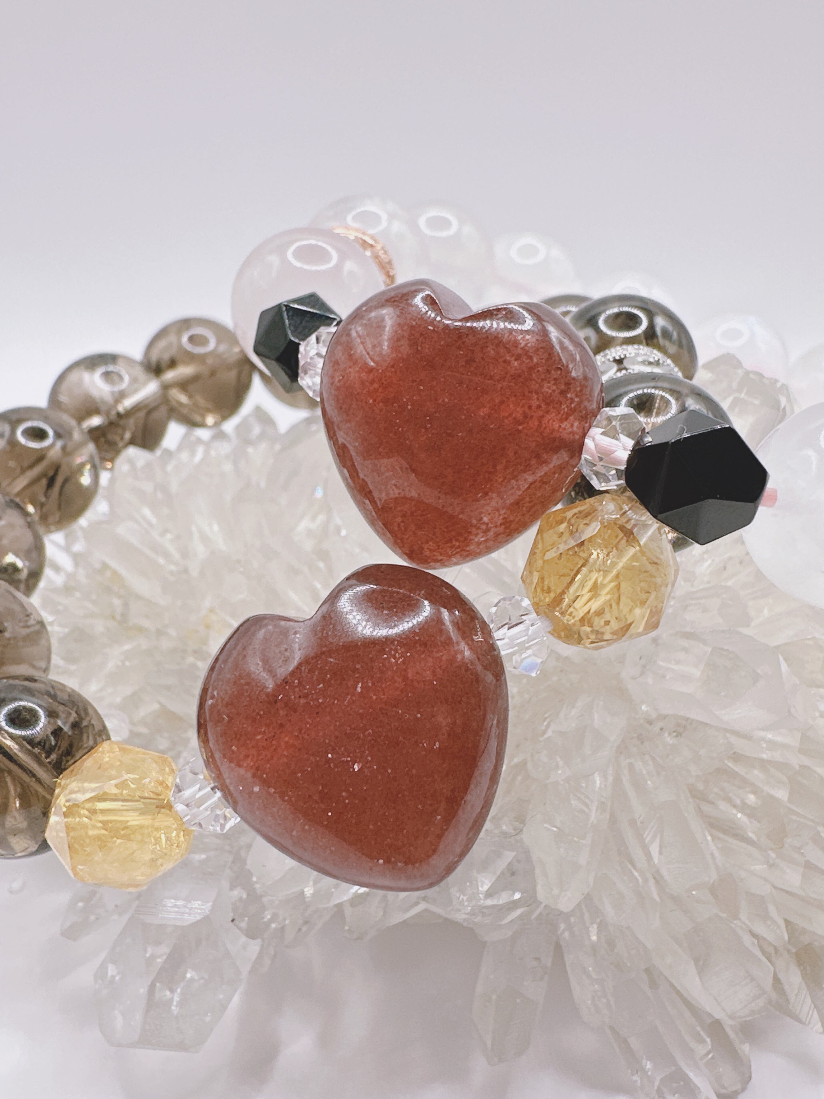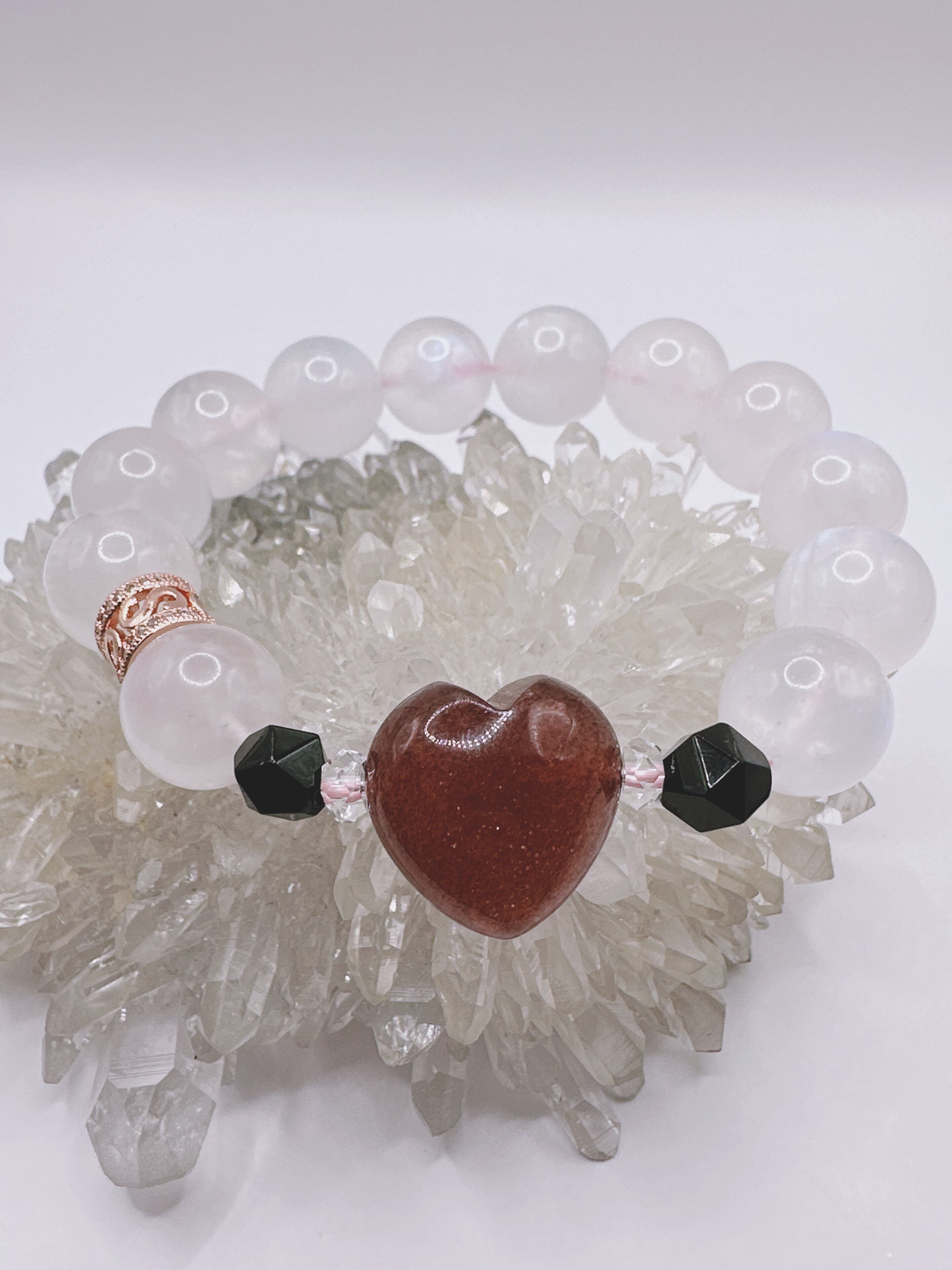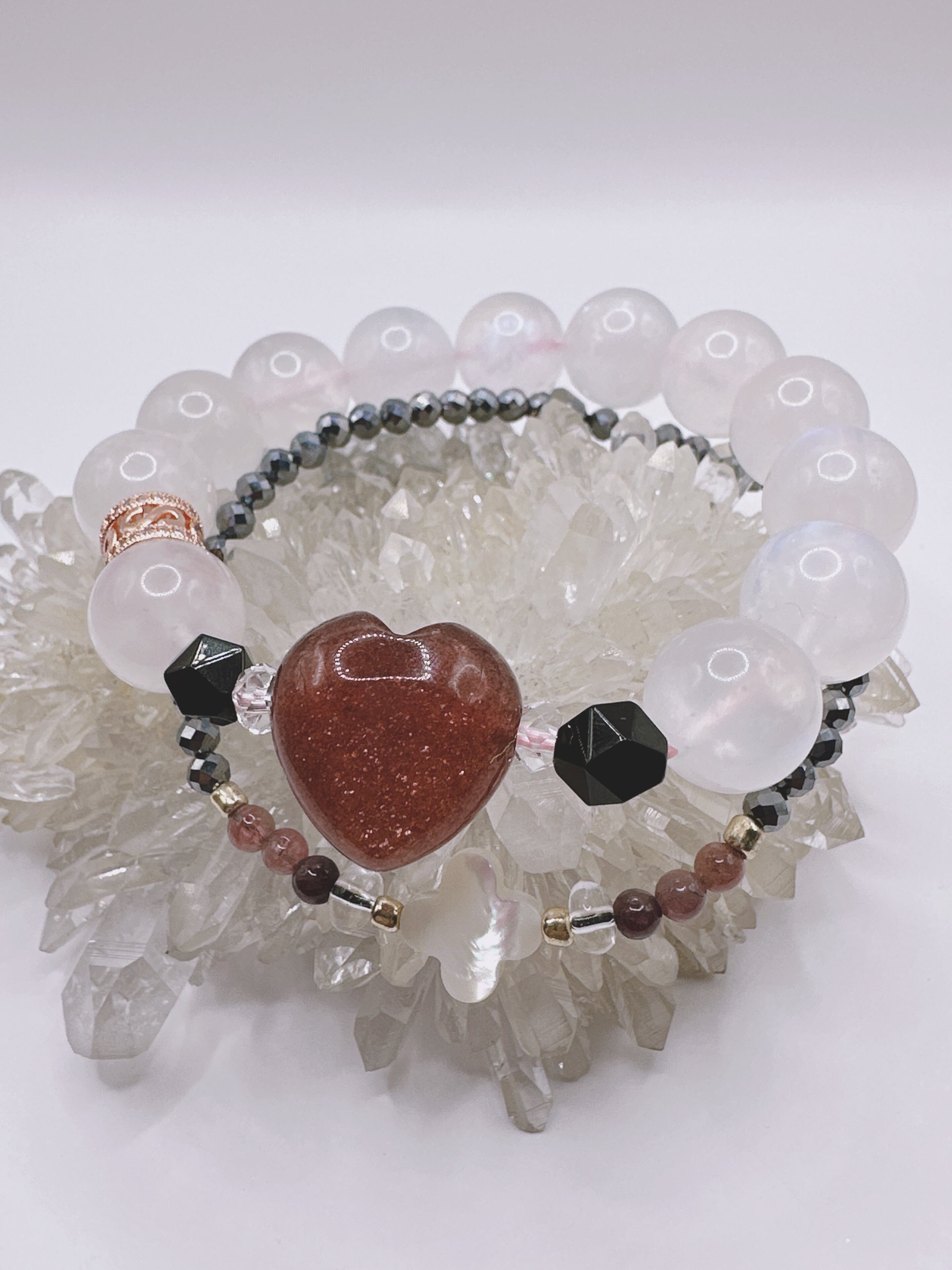ムーンストーン13mm、黒5mm、水晶、ピンクエピドートハート形